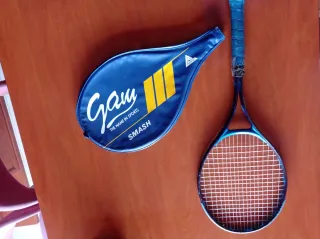 Raqueta de tenis de la marca Gau modelo SMASH, con su funda protectora azul. - Raqueta con cordaje blanco. - Funda azul con detalles amarillos y logo. - Diseño deportivo. Ideal para principiantes