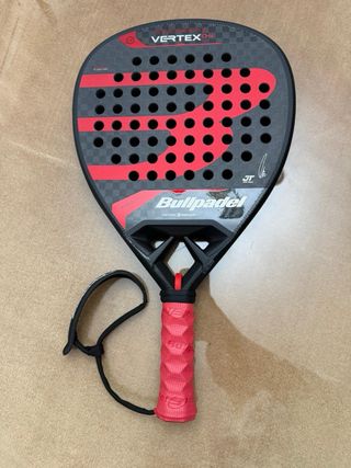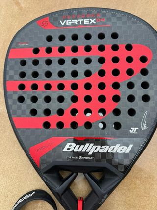 Raqueta de pádel Bullpadel Vertex 04 Pro Line. - Diseño con acabado en carbono y detalles en rojo. - Superficie con agujeros para mejor aerodinámica. - Firma de Juan Tello en la cara de la raqueta. -Raqueta con un partido de uso y con una calidad excelente, se vende por lesión.