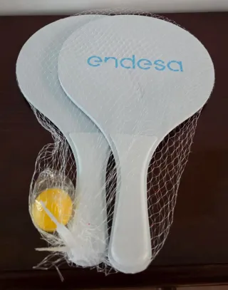 Set de dos raquetas de playa de color azul claro, con el logo de Endesa impreso. Incluye una pelota amarilla. - Dos raquetas de playa. - Una pelota. - Logo de Endesa.