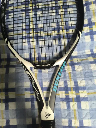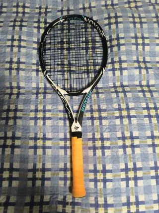 Raqueta de tenis Dunlop en buen estado, lista para jugar. Incluye funda protectora. - Raqueta de tenis Dunlop. - Funda de transporte naranja. - Algunas marcas de uso en empuñados