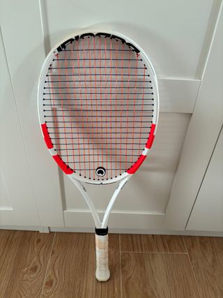 Raqueta de tenis Babolat Pure Strike impoluta - Marco blanco con detalles en rojo. - Cordaje Lynx spin 2 - Empuñadura talla puño L2 - Patron cordaje 16x20 - cabeza 100 - he jugado un par de vez, la raqueta es praticamente nueva y también el cordaje recientemente puesto