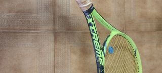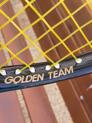 Raqueta de tenis de color amarillo. La empuñadora como nueva. + Regalo de 2 pelotas de tenis - Marco de color amarillo. - Empuñadura negra. - Cuerdas plateadas.