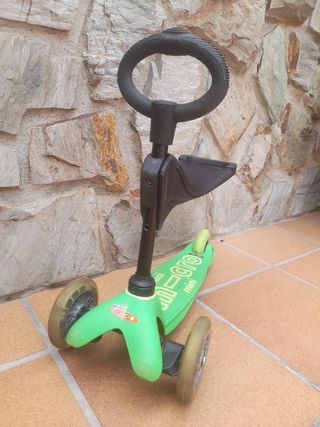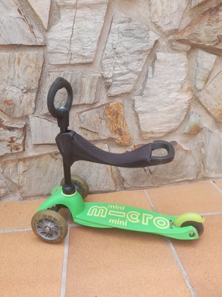 Patinete micro mini deluxe 3 en 1. Patinete evolutivo con 3 ruedas, recomendable para niños/as de 1 a 5 años. Manillar regulable de 46x68 cm. Asiento de aprendizaje tambien regulable. Con luces en las ruedas. Casco verde incluido.