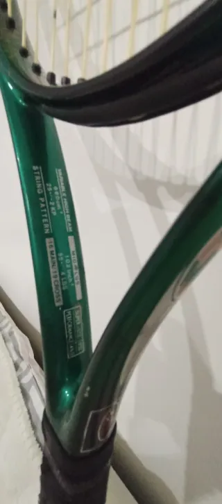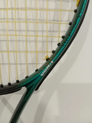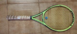 Raqueta de tenis con un diseño llamativo en color verde y detalles amarillos. Esta algo desgastada, la empuñadura y la parte de arriba un poco. + REGALO DE 2 PELOTAS DE TENIS. - Marco de color verde metálico. - Cuerdas de color claro. - Empuñadura negra.