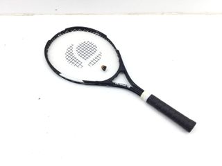Raqueta de tenis REX PROFESSIONAL. - Marco de color negro y detalles plateados. - Cuerdas blancas. - Empuñadura con el Grip de cinta desgastada.