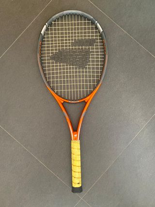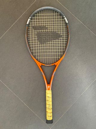 Raqueta de tenis Dunlop Revelation con un diseño llamativo. El agarre está desgastado pero puedes jugar igualmente como si fuese nueva. + Regalo de 2 pelotas de tenis - Marco de color naranja y negro. - Cuerdas blancas. - Empuñadura negra.