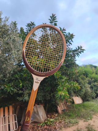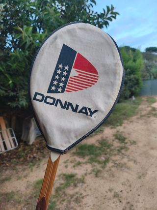 Raqueta de tenis vintage marca Donnay, modelo Karat. Ideal para coleccionistas o para revivir la nostalgia del tenis clásico. - Marco de madera. - Cuerdas en buen estado. - Diseño retro.
