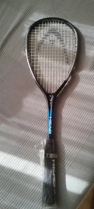Raqueta de squash de la marca HEAD. - Marco negro con detalles en azul. - Cuerdas blancas. - Empuñadura negra con plástico protector.