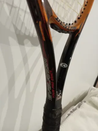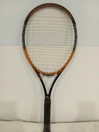 Raqueta de tenis Dunlop en buen estado, lista para jugar. Incluye dos pelotas. Si os apetece le cambias el agarre si no igualmente puedes jugar, es por gusto. - Marco de color naranja y negro. - Cuerdas blancas. - Empuñadura negra.