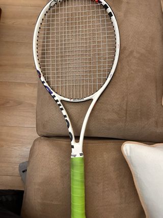 Raqueta de tenis Wilson en buen estado. Ideal para jugadores de nivel intermedio. - Marca: Wilson - Modelo: Se aprecia desgaste mínimo por el uso. - Diseño: elegante en tonos grises y blancos.