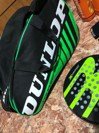 Lote de pádel con raqueta Dunlop Tour Series, bolsa de transporte y botes de bolas. - Raqueta de pádel Dunlop Tour Series. - Bolsa de transporte negra con detalles verdes. - Botes de bolas de pádel.