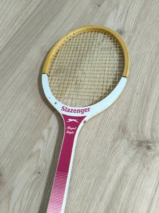 Raqueta de tenis vintage Slazenger Royal Eagle de los años 70. Se encuentra en perfecto estado de conservación. - Marco de madera y aro de color natural. - Cuerdas en buen estado. - Diseño clásico con detalles en blanco y granate.