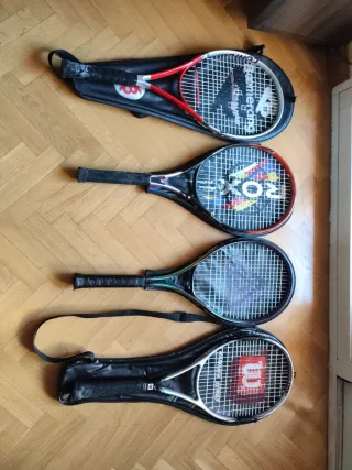 Vendo tres raquetas de tenis y varias pelotas. Están en buen estado, ideales para principiantes o jugadores ocasionales. - Incluye 3 raquetas de diferentes marcas y tamaños. - Se incluyen varias pelotas de tenis.