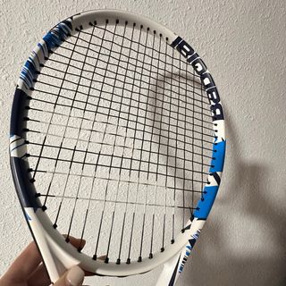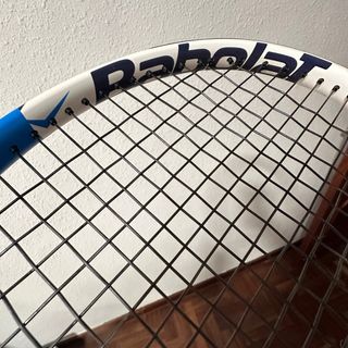 Raqueta de tenis de la marca Babolat. - Marco blanco con detalles en azul. - Cordaje negro.