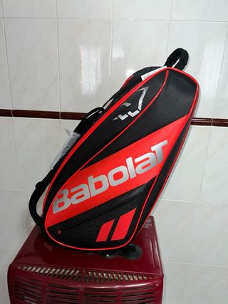 Funda para raqueta de tenis de la marca Babolat. Es de color negro con el logo blanco. - Cierre de cremallera. - Correa ajustable. Tiene una pequeña marca de estar doblada como se ve en la foto pero esta perfecta.