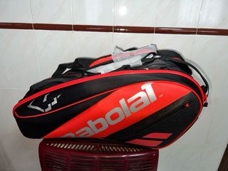 Raqueta de tenis Babolat con un agarre azul. Incluye funda. Marco negro y rojo.Cuerdas amarillas.