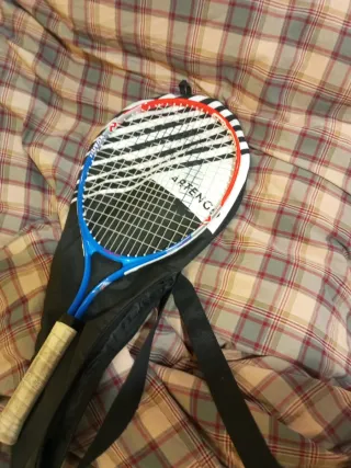 Raqueta de tenis Artengo con funda. - Marco azul y rojo. - Cuerdas blancas y negras.