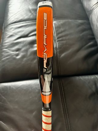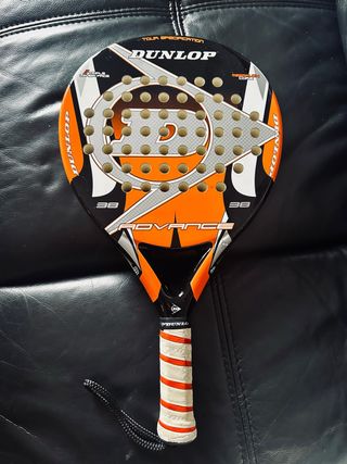 Raqueta de pádel Dunlop Advance con un peso de 38. Sin uso - Diseño en negro, naranja y blanco. - Agarre blanco con detalles naranjas. - Cordón de seguridad negro.