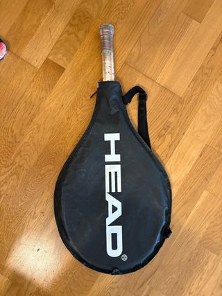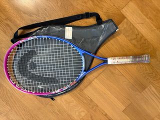 Raqueta de tenis de la marca HEAD, ideal para jugadores de todos los niveles. Incluye funda protectora. - Diseño deportivo en gris y amarillo. - Empuñadura negra con detalles plateados. - Funda negra con logo blanco.