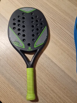 Set de dos raquetas de beach tennis marca Artengo, modelo STR 700, con un bolso para transportarlas. Incluye una pelota. - Raquetas de color negro con detalles en verde y azul. - Mangos de colores: uno verde lima y otro azul. - Bolso de color azul con el texto BEACH TENNIS RACKET.