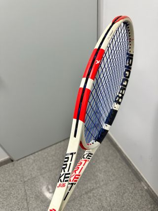 Raqueta de tenis Babolat Pure Strike JR 26 para jóvenes tenistas. Diseñada para ofrecer un buen equilibrio entre potencia y control. - Marco con diseño deportivo en blanco, rojo y negro. - Cuerdas de color azul. - Modelo: Pure Strike JR 26.