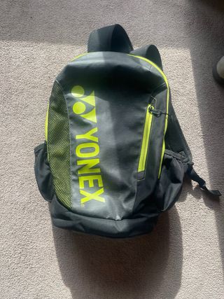 Mochila deportiva de la marca YONEX. Para una o dos raquetas - Color negro con detalles en verde lima. - Logo YONEX grande en color verde lima. - Compartimento principal con cremallera. - Bolsillos laterales de malla. - Correas ajustables para los hombros.
