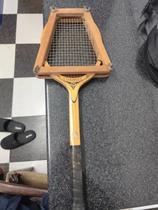 Raqueta de tenis vintage de madera marca Coronet. -Fabricada en madera con una empuñadura de cuero. -Incluye un "prensa" de madera en la cabeza para mantener la forma del marco. -El modelo es conocido como "Davis Head" o T.A.D. Coronet. Estos artículos se consideran coleccionables o equipos deportivos antiguos.