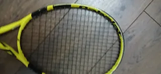 Raqueta de tenis Babolat en buen estado. Ideal para jugadores que buscan potencia y control. - Marco blanco con detalles en amarillo y negro. - Cuerdas blancas. - Logo de Babolat en el centro.
