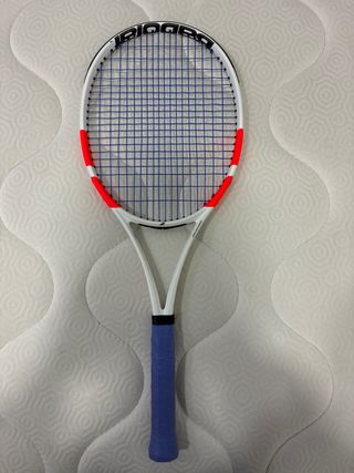 Raqueta de tenis Babolat Pure Strike 18/20. - Patrón de encordado 18x20. - Diseño en blanco con detalles en rojo. - Empuñadura azul NO NEGOCIABLE.