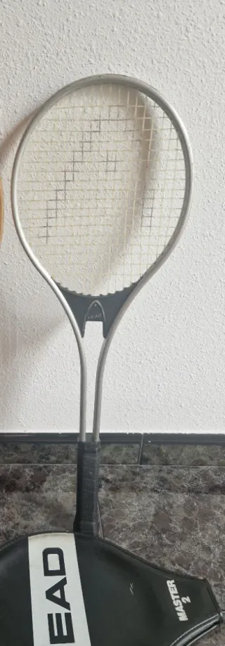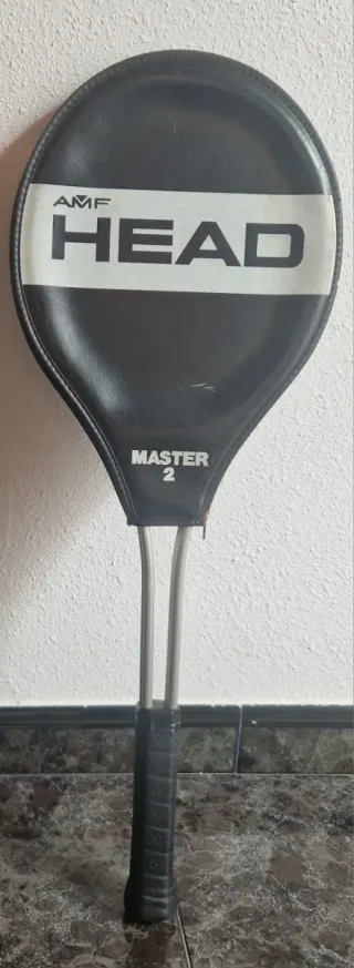 Raqueta de tenis vintage de la marca HEAD, modelo Master 2. - Marco de aluminio. - Empuñadura negra. - Cuerdas blancas.
