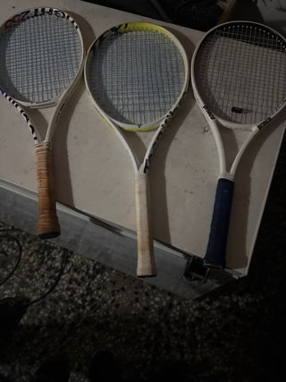 Vendo cuatro raquetas de tenis usadas. Están en buen estado, aunque muestran señales normales de uso. - Son cuatro raquetas en total. - Ideales para principiantes o jugadores ocasionales. - Se venden juntas.