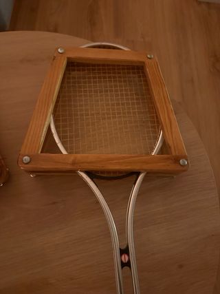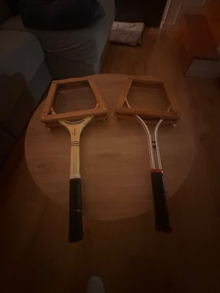 Vendo lote de dos raquetas de tenis clásicas de madera, perfectas para coleccionistas, decoración retro, atrezzo o amantes del tenis antiguo. El pack incluye: - Dunlop Maxply Fort: Un icono de la historia del tenis. Es el modelo legendario usado por jugadores como McEnroe o Rod Laver. La madera y la serigrafía se conservan bien. -Kawasaki Professional (Championship Model): Raqueta japonesa de los años 70/80. Diseño muy elegante en color blanco con detalles en granate. 🎁 DE REGALO: Incluyo una funda vintage negra con bolsillo exterior para guardarlas (ver fotos