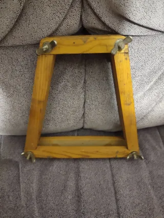 Raqueta de tenis Wilson de madera con un protector también de madera. - Marco de madera. - Red metálica. - Protector de madera. - Mango con agarre negro.