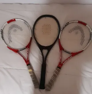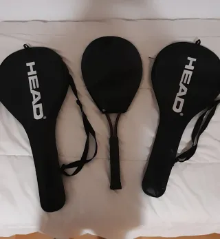 Se venden tres raquetas de tenis de la marca HEAD, cada una con su funda protectora. No envio - Tres raquetas incluidas. - Fundas negras con logo HEAD.