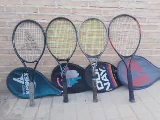 Se venden cuatro raquetas de tenis, cada una con su funda protectora. - Raqueta 1: Marca PRO KENNEX. - Raqueta 2: Funda con diseño abstracto. - Raqueta 3: Marca DUNLOP. - Raqueta 4: Funda con logo grande.