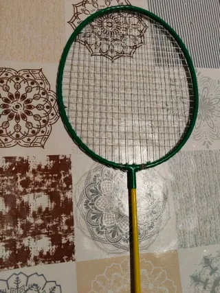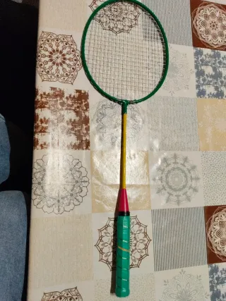 Raqueta de bádminton con un diseño llamativo. - Aro de color verde. - Mango amarillo ,con detalles en rojo. - Empuñadura verde ,con banda dorada.