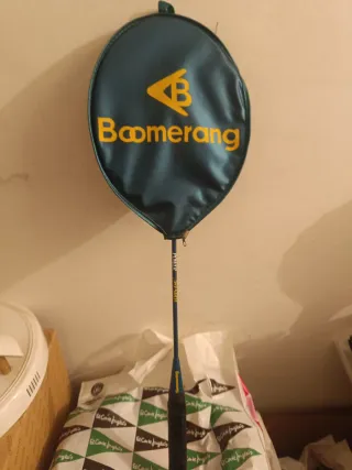 Raqueta de bádminton Boomerang con su funda protectora. - Raqueta de color azul. - Funda de color verde con logo amarillo.