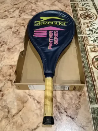 Raqueta de tenis Slazenger modelo Panther Series. - Funda protectora azul marino. - Mango de madera. - Diseño deportivo. - está un poco rota como se puede ver en la foto 3.