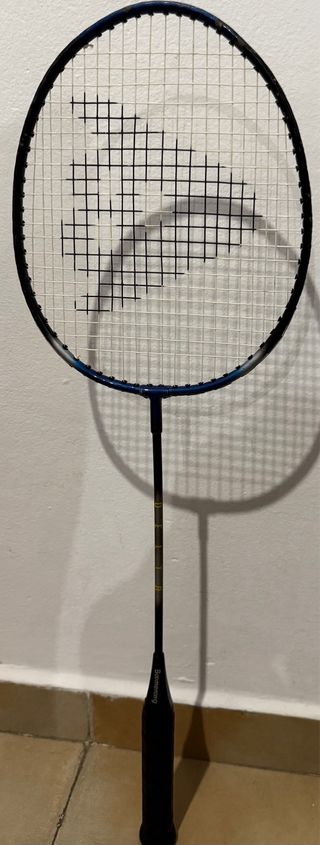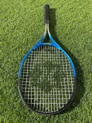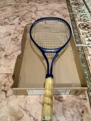 Raqueta de tenis o frontón para niños. Diseño en color azul con detalles en blanco o negro. - Tamaño adecuado para jugadores jóvenes. - Empuñadura cómoda para un buen agarre. Se ha sustituido la tela del puño. Presenta pequeños rasguñazos que no comprometen nada su utilización. En caso de que hubiera alguna otra cosa de mi muro que pudiera interesarte y procediera el envío, coméntamelo y te haría un pack a fin de que ahorres dinero en gastos