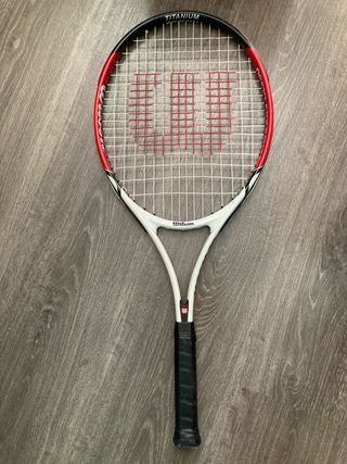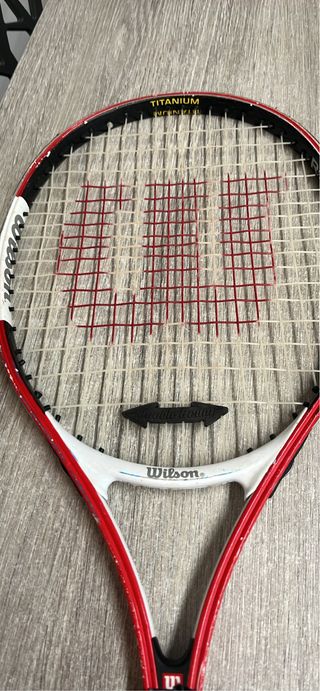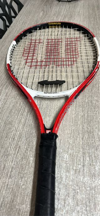 Raqueta de tenis Wilson. - Marco de titanio. - Diseño en blanco y rojo. - Logo de Wilson en el cuello.