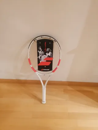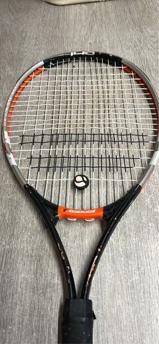 Raqueta de tenis Babolat. - Marco con detalles en naranja y negro. - Cuerdas blancas y negras. - Empuñadura negra.