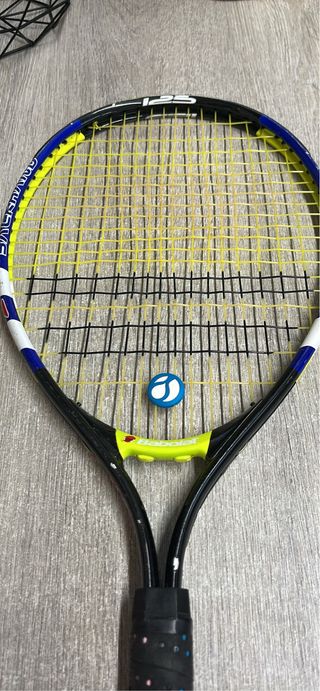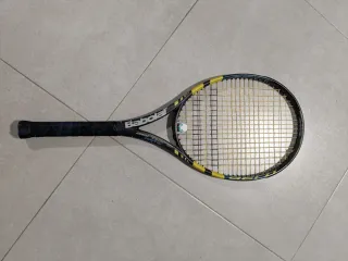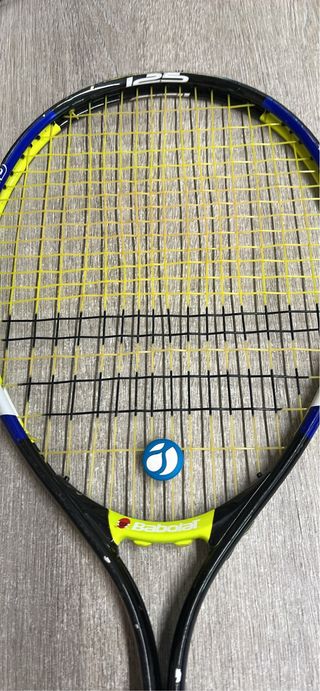 Raqueta de tenis Babolat. - Modelo 125. - Cuerdas amarillas y negras. - Detalles en azul y amarillo en el marco. - Incluye un amortiguador azul con logo blanco.