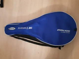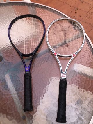 Set de 2 raquetas de tenis para niños, ideal para iniciarse en el deporte. Incluye una funda protectora. Y una pelota. - Diseño en color azul y blanco. - Cuerdas resistentes. - Funda azul con cierre. - En perfecto estado, excepto el grip desgastado con el tiempo. - Son de medida 55 largo y 25 ancho.