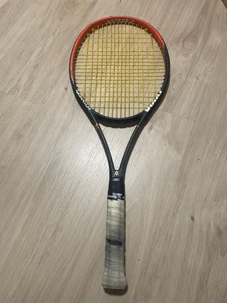 Raqueta de tenis de la marca Voiki. - Marco con detalles en color naranja. - Cuerdas de color amarillo. - Grip con cinta desgastada.