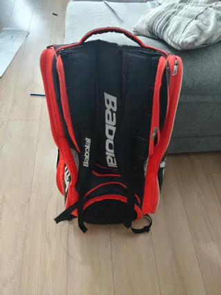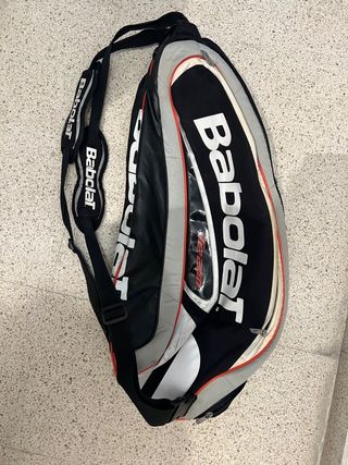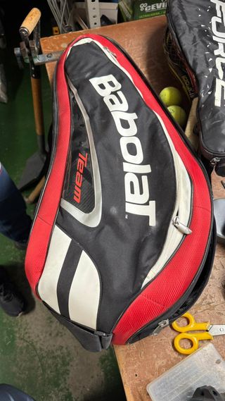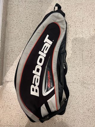 Raquetero de tenis o frontón de la marca Babolat. Raquetero con bastante uso como se ve en la fotos se está pelando. Precio negociable - Color negro con detalles en rojo. - Compartimentos amplios para raquetas y equipación. - Asas acolchadas para mayor comodidad.