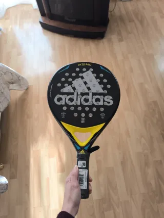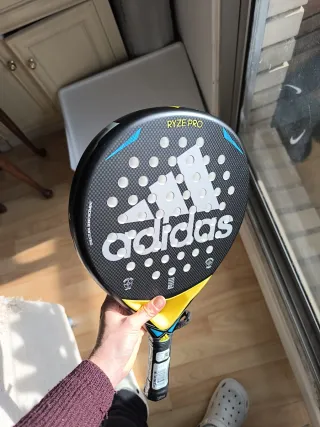 Raqueta de pádel Adidas Ryze Pro en color negro con detalles en amarillo y azul. Sin usar. - Superficie con acabado mate. - Empuñadura negra.