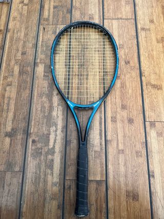 Raqueta de tenis Super Canon 100. - Marco de color azul y negro. - Empuñadura negra. - Cuerdas de color beige. tiene picazos del uso pero ningun bollo