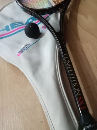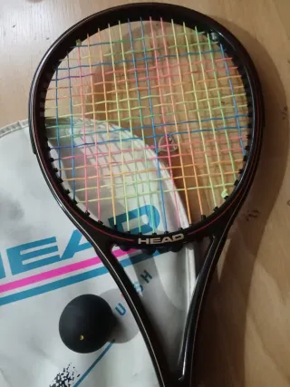 COLECCIÓN DECORACIÓN. Raqueta de squash HEAD COMPETITION de estilo antiguo. Ideal para coleccionistas o jugadores que buscan un toque retro. - Marco de color negro con detalles en rojo. - Cuerdas multicolor (amarillo, azul, rosa, naranja). - Incluye funda HEAD.