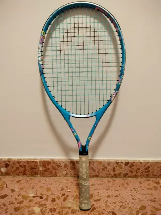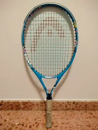 Raqueta de tenis HEAD modelo María 25. - Color azul con detalles de flores. - Empuñadura con diseño floral.