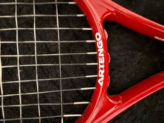 Raqueta de tenis de la marca Artengo. - Marco de color rojo y blanco. - Cuerdas blancas. - Empuñadura negra.